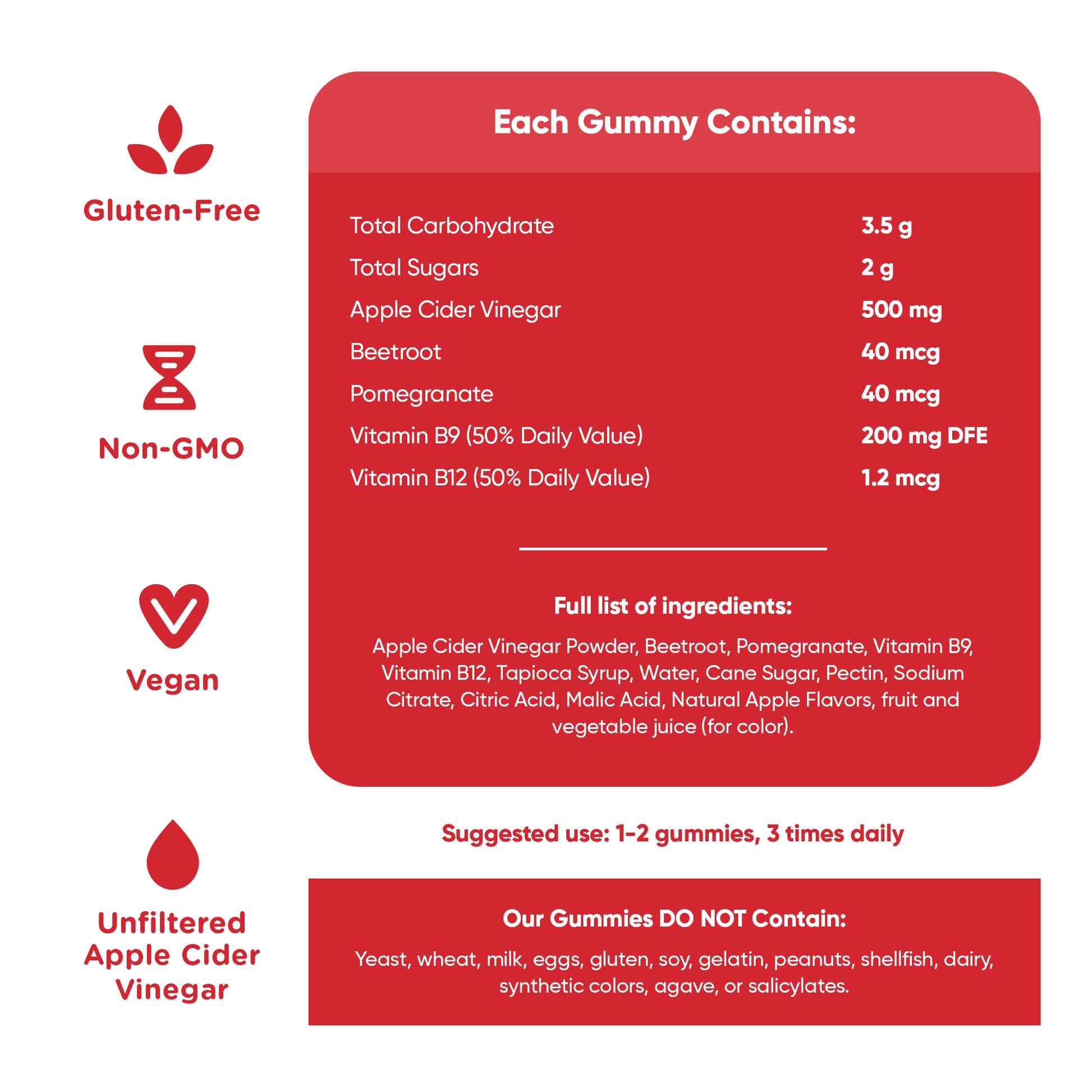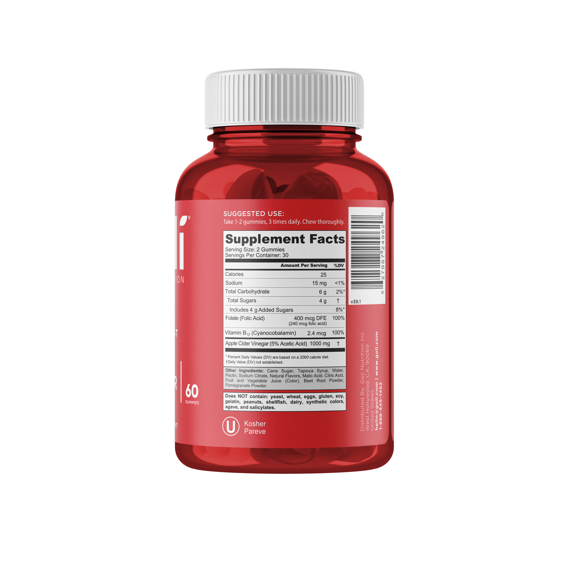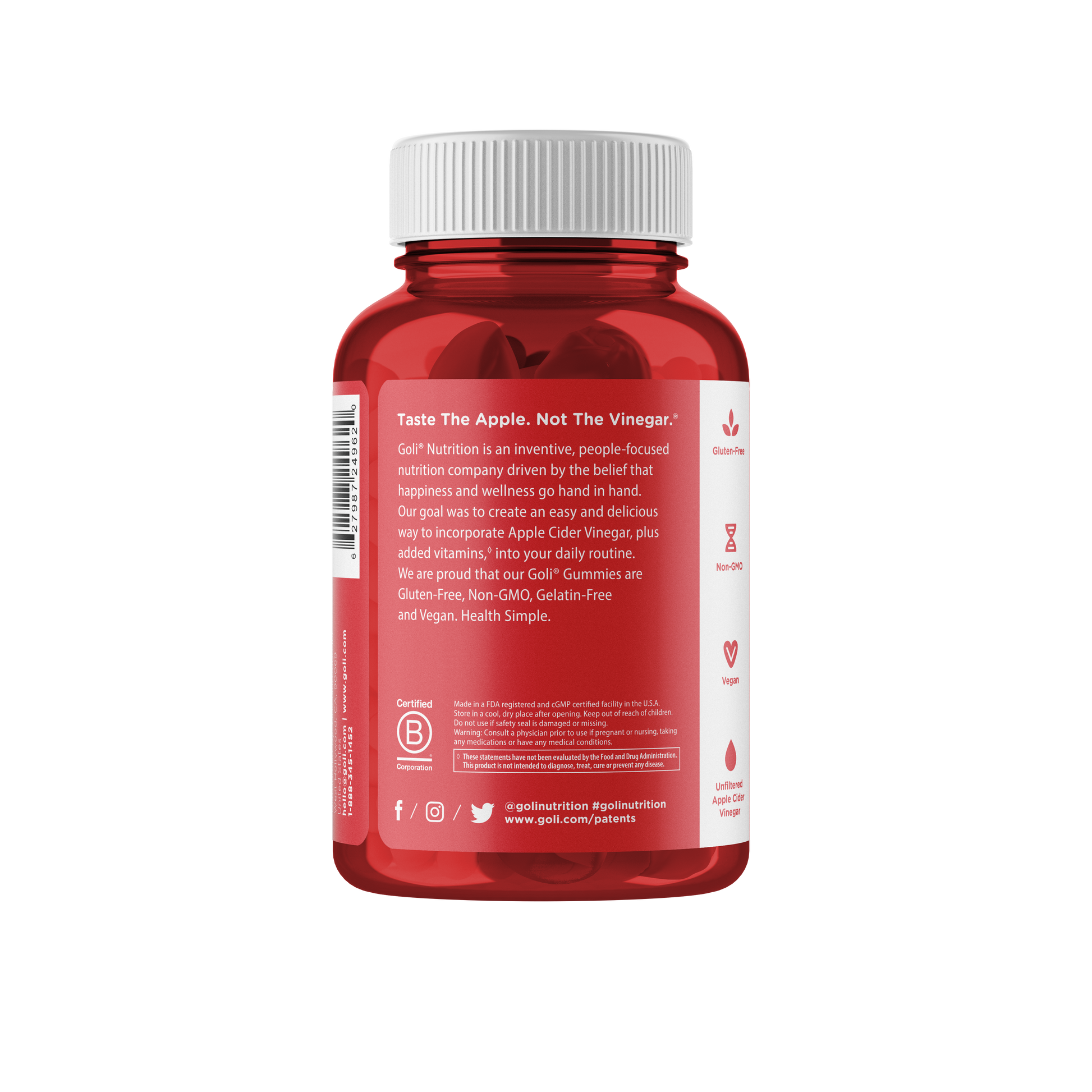 Apple Cider Vinegar has been used for centuries as a traditional remedy for digestion and gut health. Our patented formula has been carefully crafted with Vitamins B9 & B12, essential nutrients to help support cellular energy production, a healthy immune system, heart health, nutrient metabolism, a healthy nervous system, and overall good health and wellbeing. Taste the Apple. Not the Vinegar.® Goli® Nutrition is an inventive, people-focused nutrition company driven by the belief that happiness and wellness go hand in hand. We strive to provide innovative products, uniquely formulated with complementary ingredients all backed by science, in a delivery format that makes taking your daily supplements enjoyable. Health Simple.